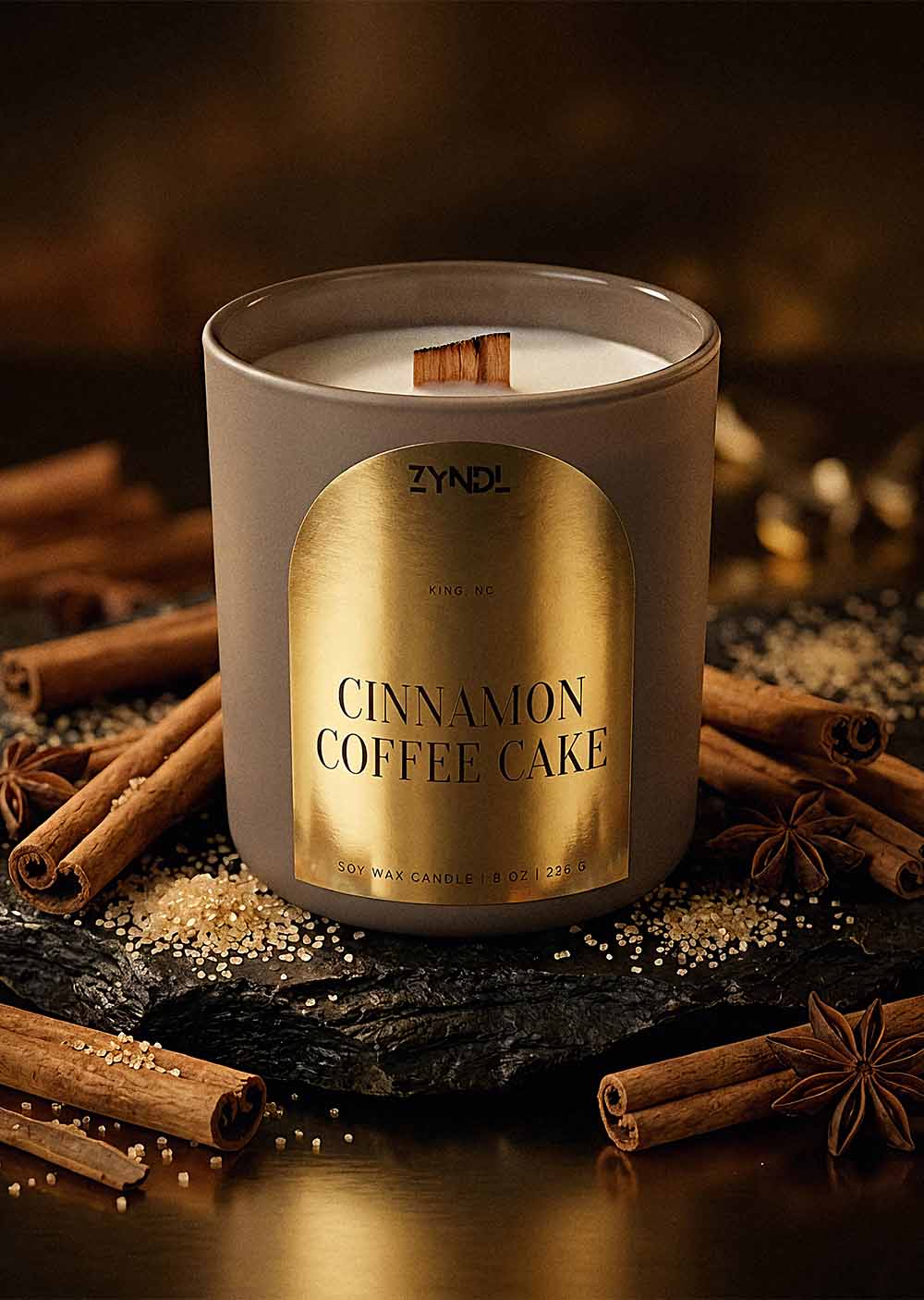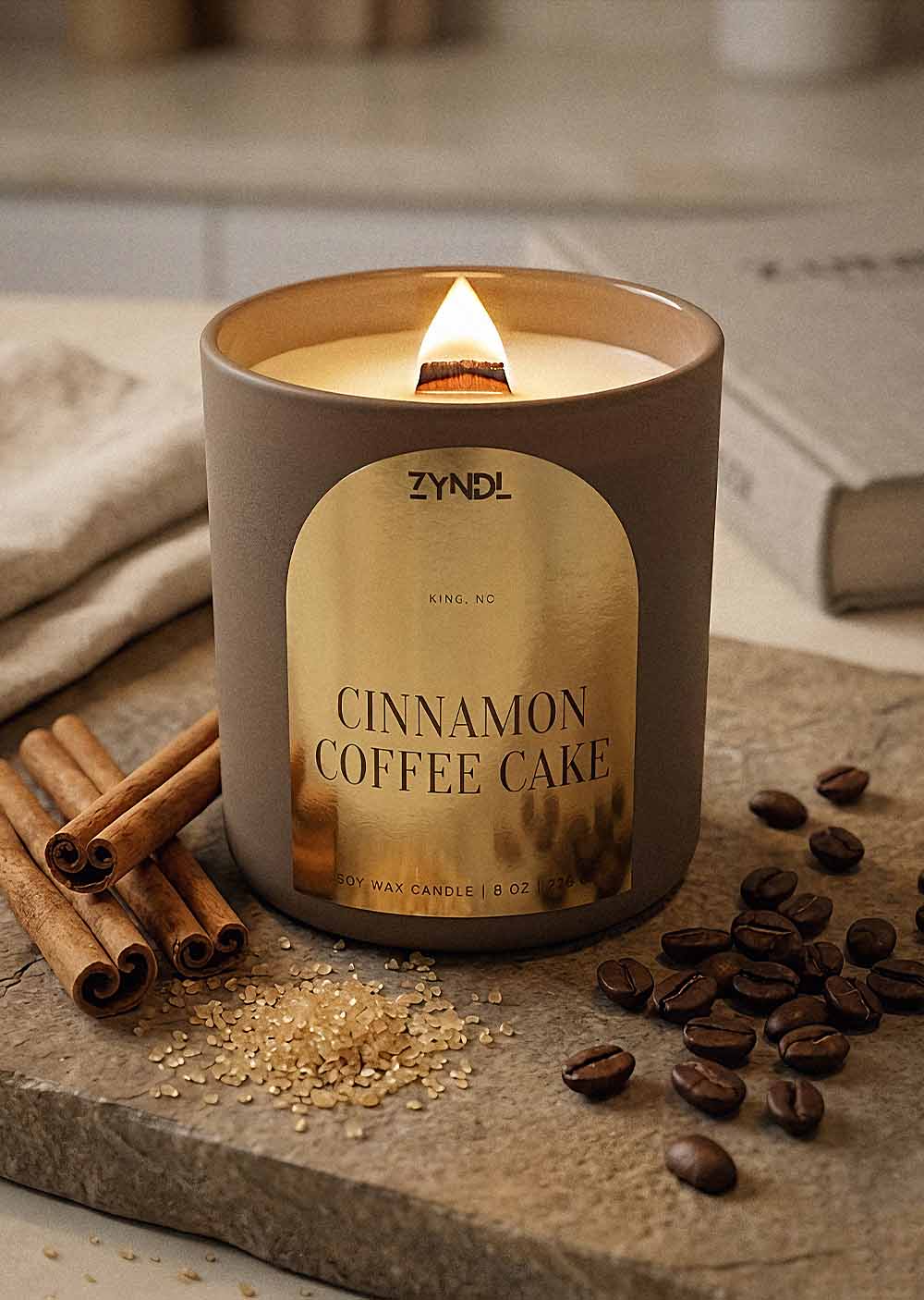 Experience the cozy crackle of our Cinnamon Coffee Cake wood wick candle, handmade in King, NC, for a relaxing bakery atmosphere. This natural soy wax candle is a premium coffee scented candle that fills your home with warm notes of cinnamon and buttercream. Every jar is phthalate free and non-toxic, making it a safe and high-quality gift for any coffee lover.