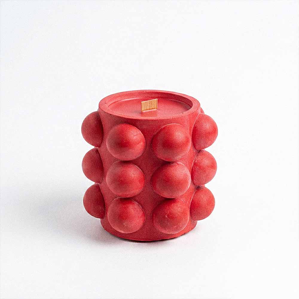 The red bubble-textured jar is sturdy and reusable. Once the candle is finished, clean it out and use it on your desk, vanity, or shelf to hold small items like jewelry, paper clips, cotton rounds, or dried herbs.