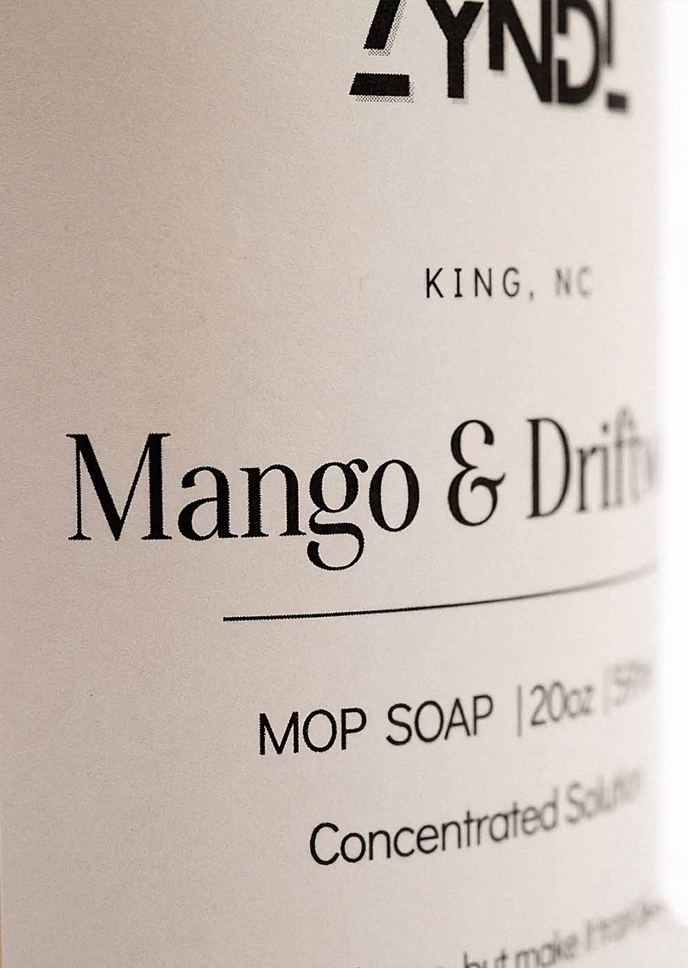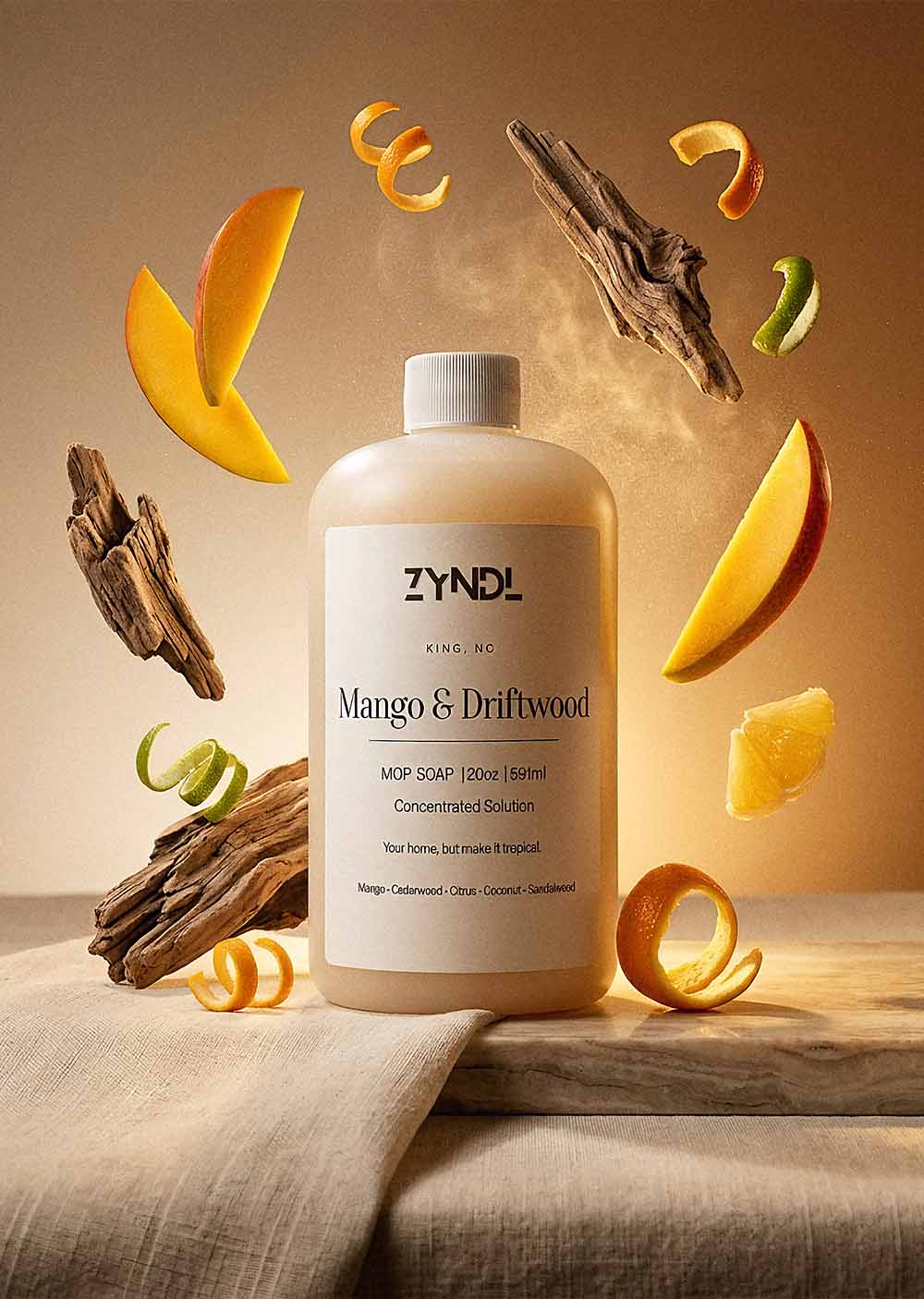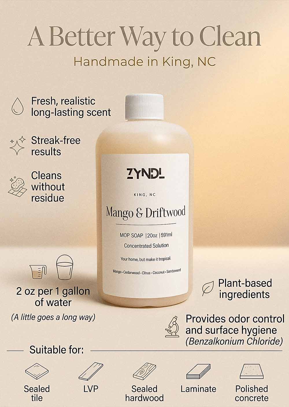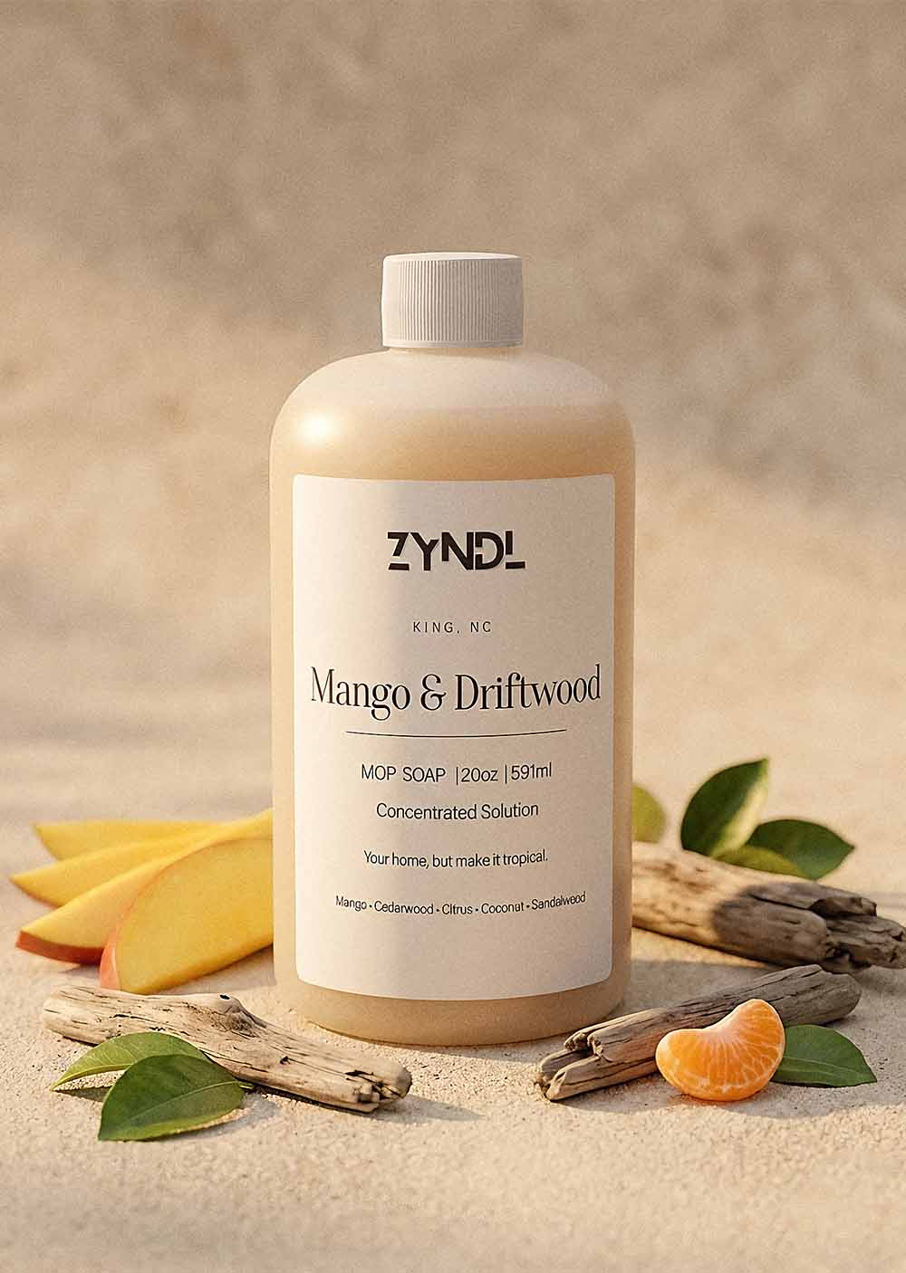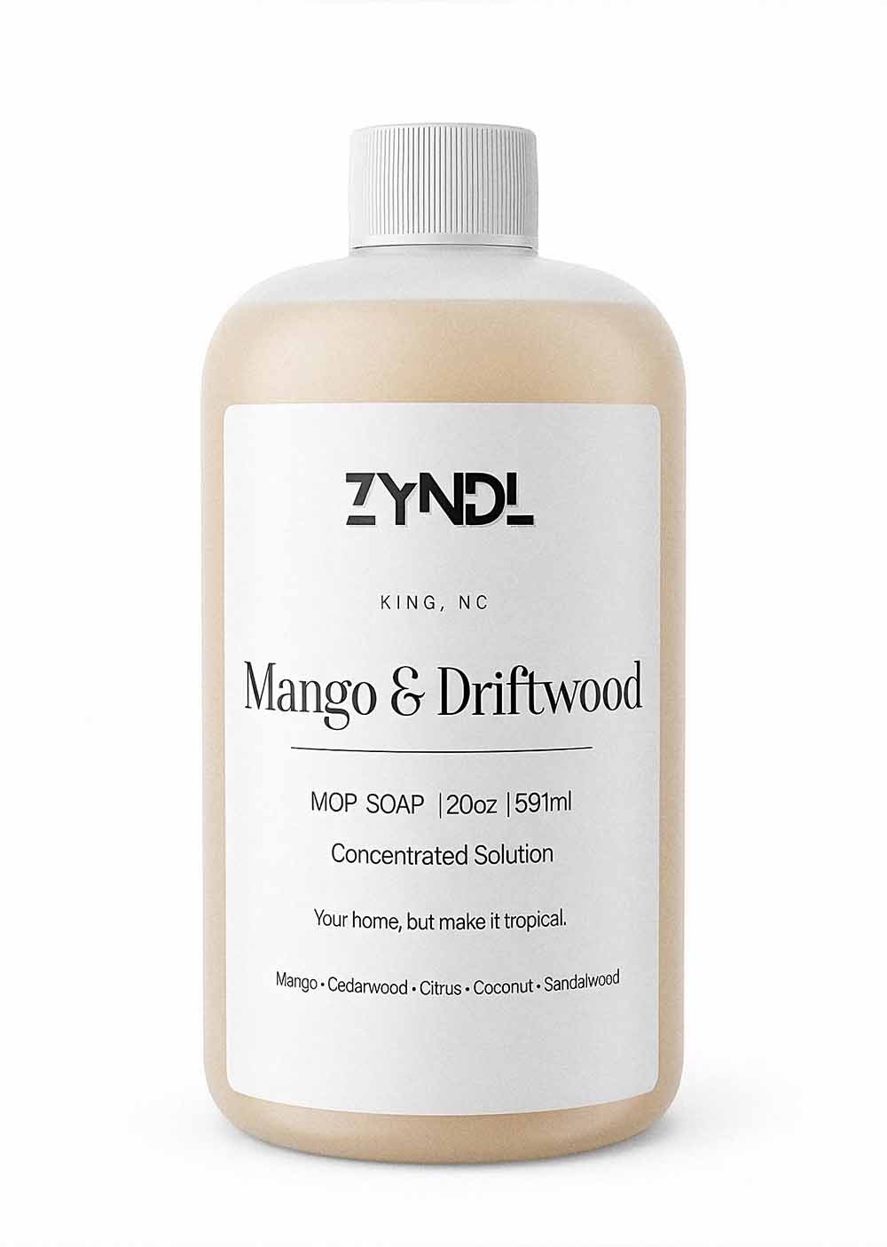 ZYNDL Mango and Driftwood Mop Soap is a concentrated, plant-based floor cleaner handmade in King, NC. One bottle makes up to 10 full mop buckets. It cleans deep, dries fast, and fills your home with the warm tropical scent of mango, cedarwood, citrus, coconut, and sandalwood.