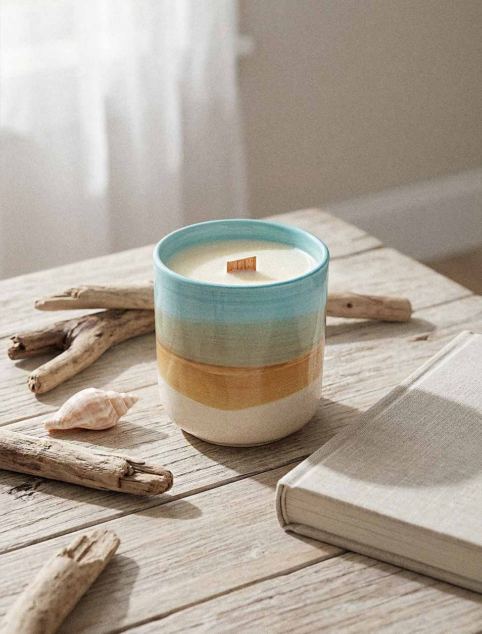 This ocean scented candle opens with bright notes of sea salt, orange peel, and fresh grass. These notes create a crisp coastal scent that feels light and refreshing.