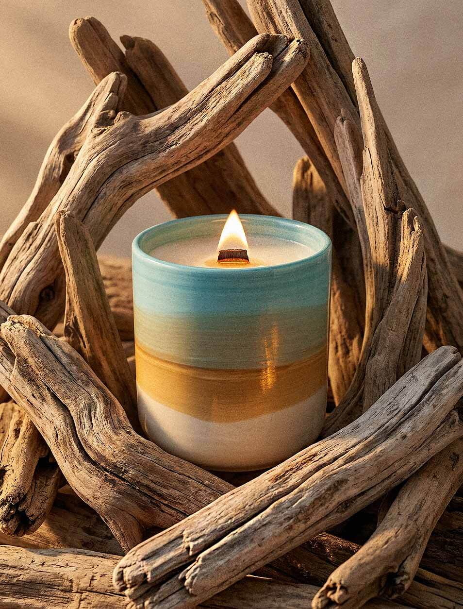 As the fragrance unfolds, sage and eucalyptus drift through the air like cool ocean mist. The scent settles into a grounding base of moss, teakwood, and patchouli, giving the candle a natural, windswept character.