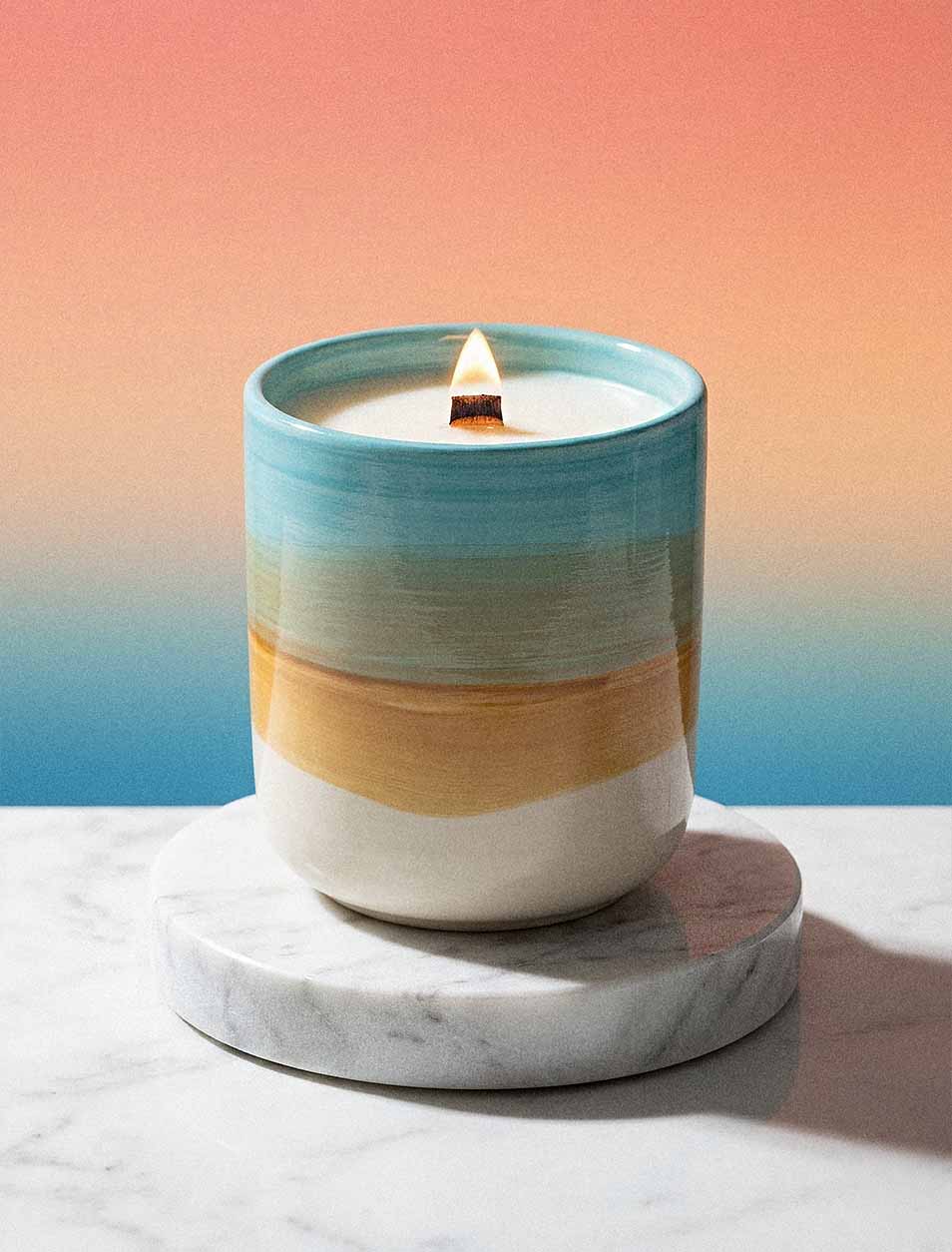Island Blues is a vibrant tropical fruits scented candle that fills your space with fresh orange, lime, and sun-kissed sweetness. This soy wax candle with a wood wick brings a fun, uplifting island vibe to any room.