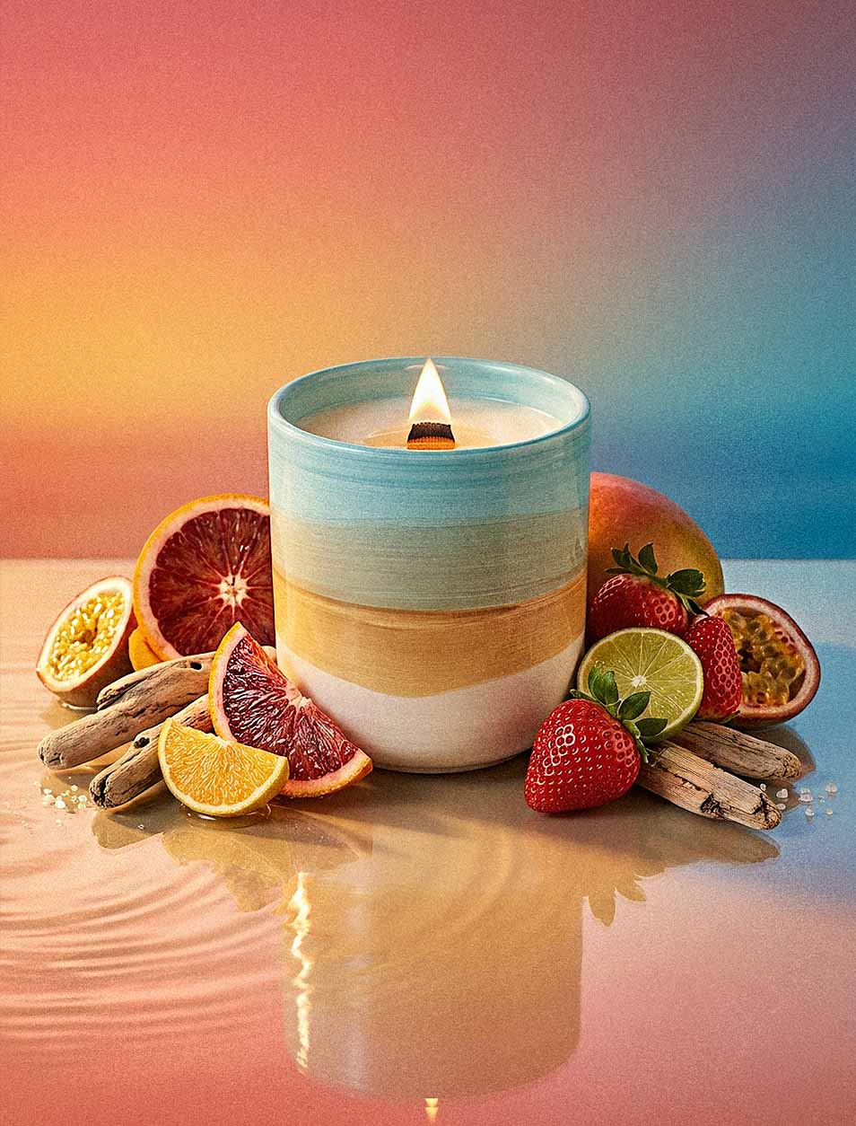 Then the scent settles into something warm. Sugar adds a gentle sweetness. Driftwood and musk give this tropical fruits scented candle a smooth, sun-warmed finish.